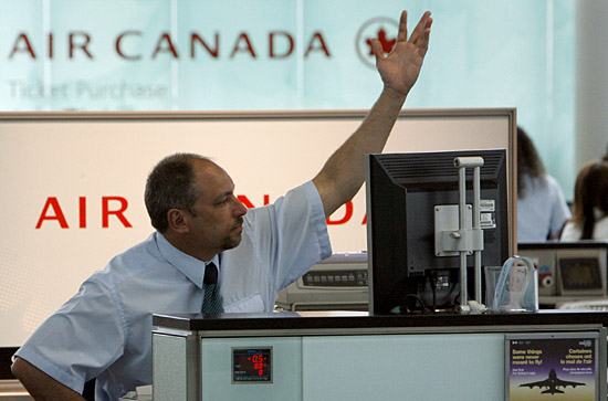 17日,一名加拿大航空公司職員在多倫多的皮爾森國(guó)際機(jī)場(chǎng)內(nèi)工作。加拿大航空公司當(dāng)天宣布將裁員2000人,并減少7%的航班,以抵消燃油價(jià)格不斷上漲帶來的損失。新華社/路透