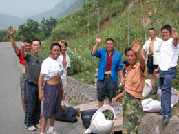 6月18日,地震災(zāi)區(qū)四川省青川縣竹園鎮(zhèn)幾位農(nóng)民準(zhǔn)備赴浙江打工。他們表示,青川受災(zāi)后全國(guó)人民給予了大力援助,但是他們不能長(zhǎng)期等待救助,大家決心用自己勤勞的雙手,自力更生解決困難。