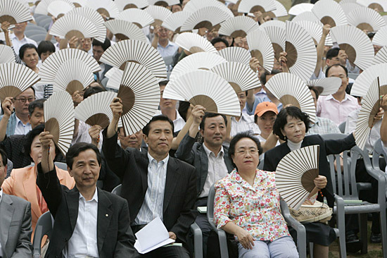 19日,在韓國首都首爾的市政廳大廈,人們手舉紙制扇子,表示對節(jié)能運動的支持。新華社/路透