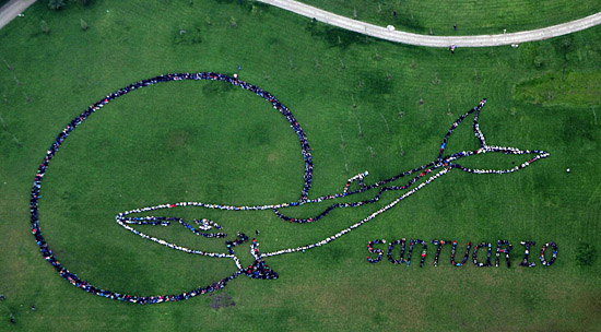 22日,人們在智利首都圣地亞哥的一片草坪上組成鯨魚的形狀和西班牙語“保護(hù)區(qū)”一詞的字樣。國際捕鯨委員會將于6月23日至27日在智利召開會議,再次就是否維持商業(yè)捕鯨禁令問題進(jìn)行討論。新華社/法新