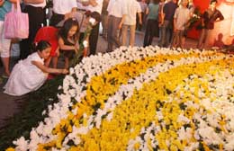 6月24日,圖片展入口處堆滿了觀展的市民獻(xiàn)上的菊花。6月19日在上海展覽中心開幕的“抗震救災(zāi) 眾志成城——2008中國抗震救災(zāi)大型新聞圖片巡回展”吸引了眾多申城市民前往參觀。截至6月24日16時,觀眾總數(shù)已達(dá)到11.5萬人。