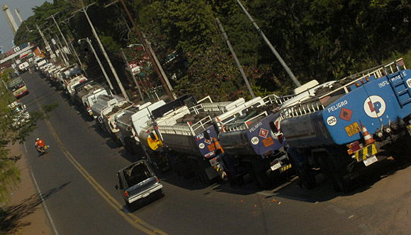 15日,在巴拉圭首都亞松森,各加油站的運油車在巴拉圭國家石油公司門外排起長隊。國際油價的大幅上漲使得石油嚴(yán)重依賴進口的巴拉圭面臨能源危機,巴拉圭國家石油公司至今仍拖欠外國石油公司3.2億美元費用,國內(nèi)成品油供應(yīng)不足。目前該國近三成公交車和出租車因缺油無法工作,正值收割季節(jié)的農(nóng)業(yè)部門也因為燃油供應(yīng)不足而蒙受損失。