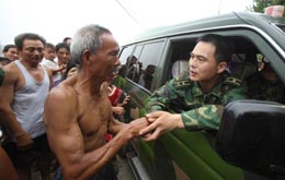 7月20日下午,63歲的木魚鎮(zhèn)受災(zāi)群眾雍汝進(jìn)拉住準(zhǔn)備撤離的抗震勇士的手久久不放。 當(dāng)日,在重災(zāi)區(qū)青川參與抗震救災(zāi)的濟(jì)南軍區(qū)某“猛虎師”官兵撤離歸建。長長的群眾送別隊(duì)伍,站滿了道路兩旁;短短的一公里,撤離的車隊(duì)走走停停用了三個(gè)小時(shí)。 鄉(xiāng)親們舍不得戰(zhàn)士們走,送別的群眾中有的是戰(zhàn)士們用雙手在廢墟中挖出來的,有的是受傷經(jīng)部隊(duì)醫(yī)療隊(duì)治療痊愈的。這支部隊(duì)在抗震一線搶救傷員、轉(zhuǎn)移群眾、清理廢墟、搭建簡易房,在受災(zāi)群眾眼中,他們已經(jīng)成為這塊土地不可缺少的一部分。 |