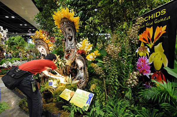 29日,在新加坡花園節(jié)上,一名工作人員在整理來自巴布亞新幾內(nèi)亞的蘭花。新加坡于7月25日至8月1日舉行花園節(jié),來自17個(gè)國家和地區(qū)的花園設(shè)計(jì)師在此展出了32件作品。新華社/法新