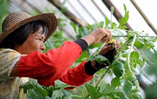 7月31日,廣西岑溪市馬路鎮(zhèn)馬路社區(qū)農(nóng)民羅富芬在“三避”技術(shù)示范基地給西瓜授粉。從2005年起,廣西先后投入1400萬元大力推廣“三避”(避雨、避寒、避曬)技術(shù),建成“三避”技術(shù)示范基地520多個、面積426萬畝,培訓(xùn)農(nóng)民360萬人次,并在試驗與示范的基礎(chǔ)上,摸索出“三避”技術(shù)栽培模式30類,涉及瓜菜、水果、水稻等作物100多種。3年來,全區(qū)依靠“三避”技術(shù),實現(xiàn)新增農(nóng)業(yè)效益83億元。 |