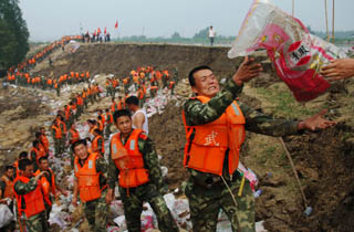 8月4日,數(shù)百名解放軍和武警官兵在加固大堤。7月31日以來(lái)的強(qiáng)降雨致使安徽滁河、得勝河、清溪河等長(zhǎng)江支流出現(xiàn)超保證水位的嚴(yán)峻汛情。8月3日,滁河大公莊段發(fā)生100余米塌方,威脅堤內(nèi)數(shù)萬(wàn)名群眾的生命財(cái)產(chǎn)安全。接到命令后,南京軍區(qū)某部和武警蚌埠支隊(duì),迅速調(diào)集2500多名官兵除險(xiǎn)加固大堤。廣大官兵冒著高溫,連續(xù)奮戰(zhàn)。截至記者發(fā)稿時(shí),大堤加固已取得階段性成功,險(xiǎn)情得到基本控制。 |