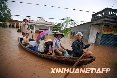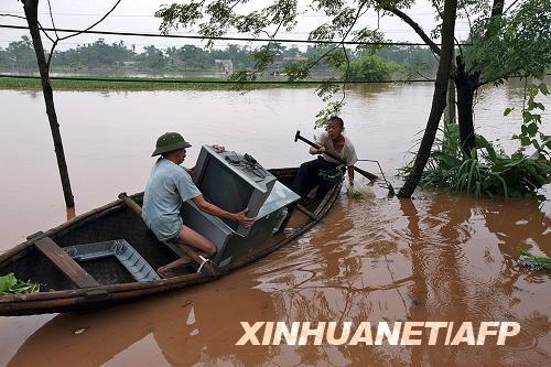8月9日,在越南富壽省的夏和地區(qū),當(dāng)?shù)孛癖姵俗〈x開(kāi)被洪水淹沒(méi)的村莊。新華社/法新