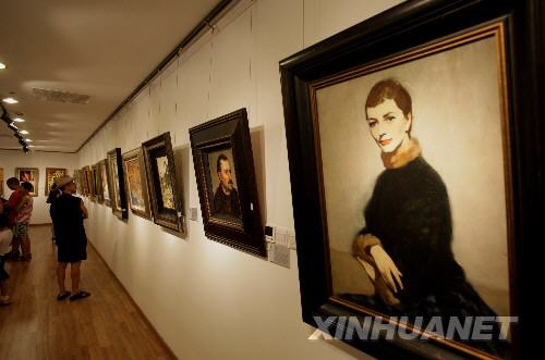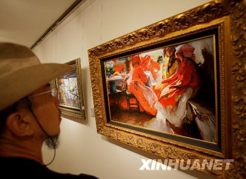 8月9日,參觀者在觀看繪畫作品。 當(dāng)日,俄羅斯繪畫大師精品展在北京橋藝術(shù)中心開幕。近百幅俄羅斯繪畫大師的油畫作品參展。