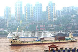 8月12日,一艘貨輪正經(jīng)過長江重慶主城段。由于上游連續(xù)降雨,長江重慶段江水持續(xù)上漲。當(dāng)日,洪峰順利通過重慶主城區(qū)。相關(guān)部門已沿江邊張貼洪峰告示,提醒市民注意安全。