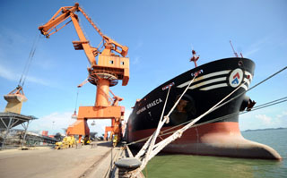 8月13日,一艘外籍貨輪停靠欽州港勒溝作業(yè)區(qū)卸貨。據(jù)南寧海關統(tǒng)計,2008年上半年廣西北部灣經(jīng)濟區(qū)進出口29.9億美元,同比增長83.3%。防城港、南寧、欽州三市分別以12億美元、8.7億美元、6.2億美元位列經(jīng)濟區(qū)進出口前三,其中欽州增速最快,達1.2倍。