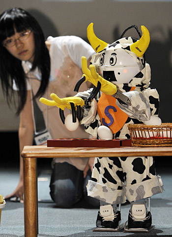 17日,在日本神奈川縣舉辦的家務(wù)機(jī)器人競賽預(yù)賽上,一個機(jī)器人從籃子里撿起雞蛋擺放到架子上。15個家務(wù)機(jī)器人參加了這次預(yù)賽。新華社/法新