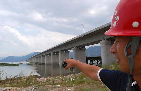 8月25日,一名工人介紹溫福鐵路建設(shè)情況。8月26日凌晨,全國“八縱八橫”鐵路網(wǎng)骨架之一的國家重點(diǎn)建設(shè)項(xiàng)目溫福鐵路全線跨度最大的橋梁——田螺大橋順利合龍。溫福鐵路是中國沿海鐵路大通道,建成后將使溫州市與珠江三角洲、長江三角洲以及海峽西岸經(jīng)濟(jì)區(qū)三大經(jīng)濟(jì)發(fā)達(dá)地區(qū)連接起來,對促進(jìn)區(qū)域經(jīng)濟(jì)協(xié)調(diào)發(fā)展與優(yōu)勢互補(bǔ)、完善沿海綜合交通體系等有著重要的意義。 | |