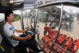 9月3日,在河南省沁陽(yáng)市農(nóng)機(jī)大世界,遠(yuǎn)大農(nóng)機(jī)專(zhuān)業(yè)合作社理事長(zhǎng)王勝會(huì)在選購(gòu)大型玉米聯(lián)合收割機(jī)。秋收臨近,沁陽(yáng)市采取政府資金補(bǔ)貼、政策扶持等措施,鼓勵(lì)農(nóng)民購(gòu)買(mǎi)大型玉米聯(lián)合收割機(jī)。