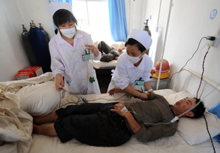9月18日,尋甸縣人民醫(yī)院護士為中毒人員測量心率。