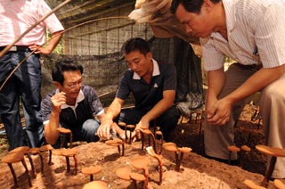 9月18日,海南省瓊中黎族苗族自治縣承信農(nóng)業(yè)開發(fā)有限公司技術員唐望賢(右二)和縣農(nóng)業(yè)技術推廣中心副主任李茂才(右一)在該縣營根鎮(zhèn)新豐村向農(nóng)民傳授靈芝種植技術。瓊中黎族苗族自治縣地處海南五指山深處,是國家級貧困縣。該縣農(nóng)業(yè)技術推廣中心和瓊中縣承信農(nóng)業(yè)開發(fā)有限公司無償向當?shù)厝齻鄉(xiāng)鎮(zhèn)的30余戶農(nóng)民提供靈芝種植技術和種苗,幫助農(nóng)民開拓新的生產(chǎn)致富門路。 |