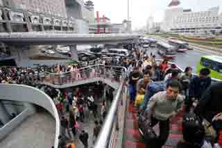 10月5日,旅客走過北京西站邊的一座天橋。當日是國慶長假最后一天,北京迎來返城客流高峰。