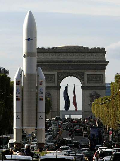 4日,一個(gè)阿麗亞娜5型火箭模型在法國(guó)巴黎香榭麗舍大街上展出。當(dāng)天,法國(guó)航空航天工業(yè)百年紀(jì)念展在香榭麗舍大街拉開帷幕,并將持續(xù)到10月12日。