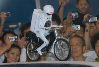 10月12日,在深圳舉辦的第十屆中國國際高新技術(shù)成果交易會上,機(jī)器人表演騎自行車通過呈“S”形狀的木板。這個(gè)由日本參展商帶來的騎車機(jī)器人裝有超聲波傳感器、陀螺儀傳感器和震動(dòng)傳感器,感知到的信息可從傳感器傳到電腦,由電腦通過信息處理和傳輸來控制機(jī)器人騎車的速度和方向等。