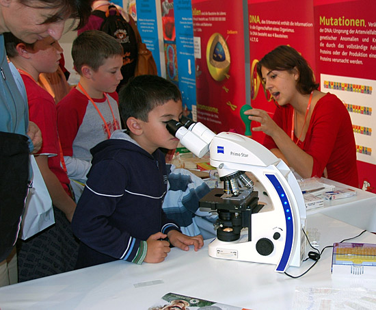 12日,在奧地利首都維也納市政廳廣場舉行的科普日活動上,一名兒童通過顯微鏡觀察微觀世界。維也納市政府利用周末在市政廳廣場舉行科普日活動,圖片、模型、電腦演示和實際操作等豐富內(nèi)容吸引了大批市民前來參觀。