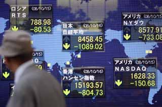 10月16日,行人從日本東京一塊日經(jīng)股指顯示板前走過。受歐美股市大跌和投資者擔心世界經(jīng)濟形勢惡化等因素影響,當天東京股市日經(jīng)225種股票平均價格指數(shù)比前一個交易日下跌1089.02點,收于8458.45點,跌幅為11.41%。