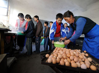 靜樂縣段家寨中心小學的學生正在領(lǐng)取雞蛋。