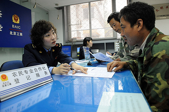 10月22日,北京西城工商局德勝工商所工作人員在新近開設(shè)的農(nóng)民專業(yè)合作社登記服務臺前為農(nóng)民工提供咨詢服務。北京工商部門積極開展農(nóng)民專業(yè)合作社的登記發(fā)展工作,大力培育和發(fā)展農(nóng)村經(jīng)紀人,為切實搞活農(nóng)產(chǎn)品流通,推進農(nóng)村發(fā)展做好服務工作。 | |