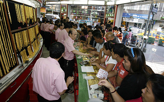 25日,曼谷市民在泰國曼谷唐人街一家金店搶購金飾。受國際金價下跌影響,24日曼谷金價大跌,曼谷唐人街多數(shù)金店的金條被搶購一空。