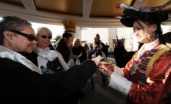 10月28日,一名藏族姑娘為美國游客敬獻青稞酒。