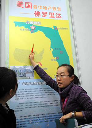 10月30日,一名工作人員在向購房者介紹位于美國佛羅里達的房產項目。