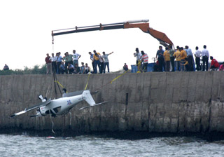 11月5日,打撈人員將墜海飛機(jī)吊上岸。