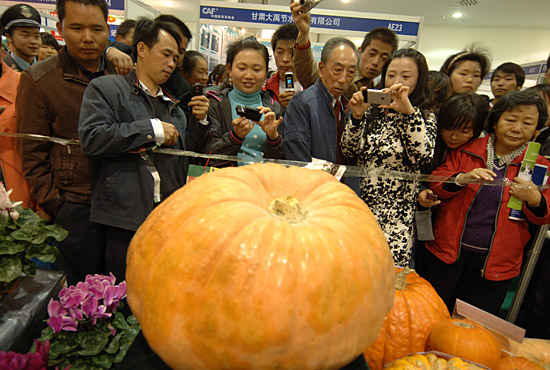 11月5日,參觀者在楊凌農(nóng)高會(huì)上觀看甘肅天水一家企業(yè)選育的、重達(dá)96公斤的太空南瓜。當(dāng)日,第十五屆中國(guó)楊凌農(nóng)業(yè)高新科技成果博覽會(huì)在“農(nóng)科城”陜西楊凌開(kāi)幕,共有5700多個(gè)農(nóng)業(yè)科技項(xiàng)目在展會(huì)上亮相。來(lái)自27個(gè)國(guó)家和地區(qū)及國(guó)內(nèi)26個(gè)省區(qū)市的900多家企業(yè)參展參會(huì)。據(jù)介紹,自1994年起,楊凌農(nóng)高會(huì)已連續(xù)成功舉辦了14屆,年均參會(huì)人數(shù)達(dá)到130萬(wàn)人次,經(jīng)濟(jì)效益累計(jì)達(dá)1400多億元。 | |