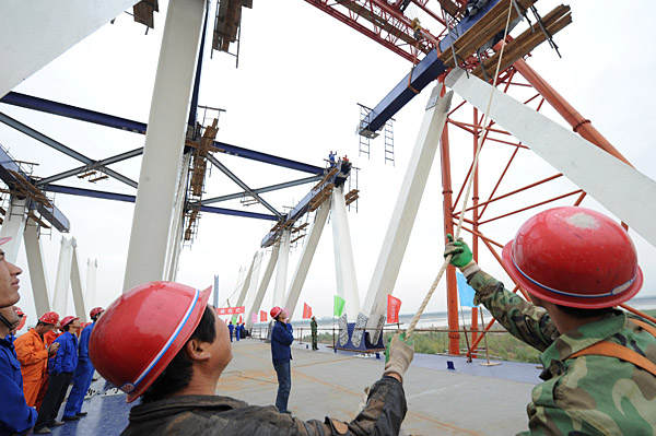 11月6日,中鐵大橋局的建設(shè)者在鄭州黃河公路鐵路兩用橋上架設(shè)鋼梁。當(dāng)日,鄭州黃河公路鐵路兩用橋開始架設(shè)鋼梁,這標(biāo)志著大橋工程的控制性節(jié)點工作全面展開。鄭州黃河公路鐵路兩用橋是京廣客運(yùn)專線和公路大橋跨越黃河的共用橋梁,公路鐵路采用上下兩層分布,合建部分全長9177米,工程將于2010年7月完工。