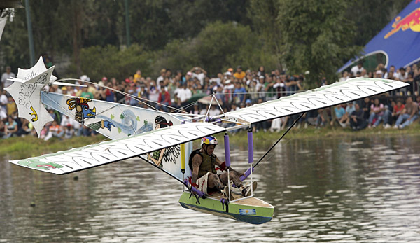 9日,在墨西哥首都墨西哥城,一名選手乘坐飛行器參加比賽。墨西哥城當日舉行人力飛行大賽,多支隊伍使用各式各樣的人力飛行器參賽,飛行距離最遠者獲得冠軍。新華社/路透