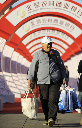 11月13日,一位觀眾提著資料走出北京展覽館。當(dāng)日,第四屆北京國(guó)際金融博覽會(huì)在北京展覽館開(kāi)幕,本屆博覽會(huì)會(huì)聚國(guó)內(nèi)百余家銀行、基金、證券、保險(xiǎn)等金融機(jī)構(gòu),近千種金融理財(cái)產(chǎn)品在博覽會(huì)上集中展示。
