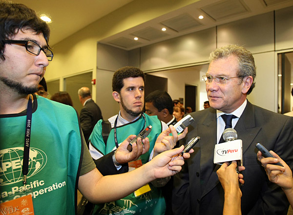 16日,在秘魯首都利馬,秘魯外交部副部長岡薩洛·古鐵雷斯(右)在亞太經(jīng)合組織(APEC)高官會議召開前接受采訪。當(dāng)天,APEC21個成員的高官齊聚秘魯國家博物館,就世界經(jīng)濟和金融形勢、支持世界貿(mào)易組織多哈回合談判、亞太地區(qū)經(jīng)濟一體化等議題交換意見。高官會議的召開標(biāo)志著本屆APEC領(lǐng)導(dǎo)人會議周正式拉開帷幕。 | |