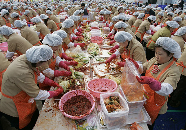 20日,在韓國(guó)首都首爾市政廳前,韓國(guó)Yakult公司的員工正在制作泡菜。當(dāng)日,在韓國(guó)的首爾、釜山和仁川等6個(gè)城市,Yakult公司的約5000名員工參加了制作泡菜的活動(dòng)。他們共使用了12萬(wàn)顆白菜制作泡菜。新華社/路透