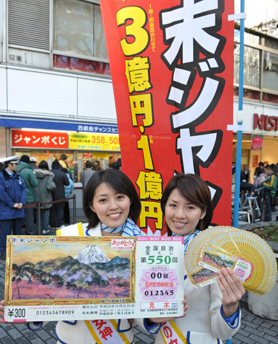 25日,在日本首都東京,兩名促銷員展示年末彩票。臨近年末,成千上萬(wàn)的日本人前往彩票銷售柜臺(tái)購(gòu)買彩票,期望博得3億日元(約合2100萬(wàn)元人民幣)的年終巨獎(jiǎng)。新華社/法新