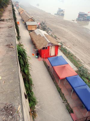 這是在長江防洪堤壩上搭建的茶館和休閑篷。近段時(shí)間以來,位于重慶市九龍坡區(qū)鵝公巖長江大橋北橋頭一側(cè)的堤岸上,一些經(jīng)營者未經(jīng)許可搭建起一批吊腳樓式建筑物作為茶館和休閑場所。這些違章建筑存在嚴(yán)重的安全隱患,而且對防洪大堤造成了一定的破壞。