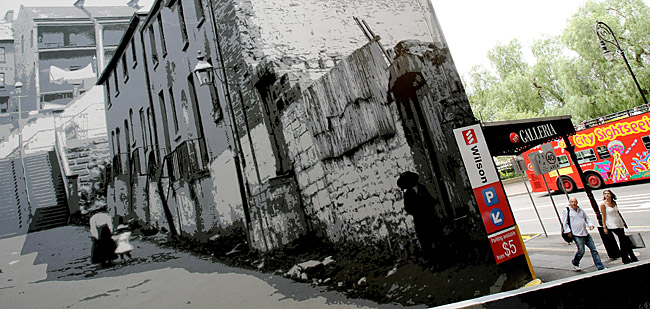 10日,在澳大利亞悉尼街頭,游客在小埃塞克斯街舊景的巨幅壁畫旁走過。這些壁畫展現了1901年的悉尼街景。新華社/法新