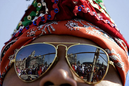 12日,在墨西哥首都墨西哥城的瓜達(dá)盧佩教堂門(mén)口,一個(gè)朝圣者的墨鏡反射出人們表演民族舞蹈的畫(huà)面。當(dāng)日是墨西哥傳統(tǒng)的瓜達(dá)盧佩圣母節(jié),墨西哥人舉行各種活動(dòng)慶祝節(jié)日。新華社/法新
