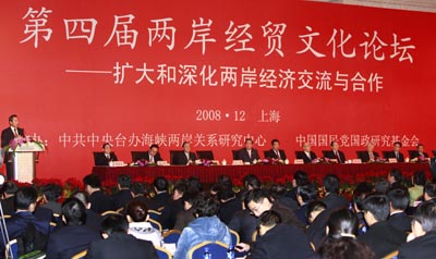 12月21日,第四屆兩岸經(jīng)貿(mào)文化論壇在上海閉幕。中共中央政治局常委、全國(guó)政協(xié)主席賈慶林和中國(guó)國(guó)民黨主席吳伯雄出席閉幕式。