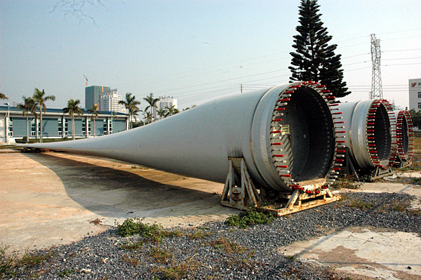目前國內最大的2.5兆瓦風力發(fā)電項目正在廣西北海市緊張施工,預計3月份即可投產。它是當?shù)匾患绎L力發(fā)電設備生產企業(yè)的示范項目,高達80米的機艙由德國設計師盧吉·科拉尼(Luigi Colani)設計,巨大的風車建成后將成為當?shù)匾粋標志性景觀。機組年發(fā)電達400萬千瓦小時,可滿足1600戶居民用電。圖為已制成的長達45米的風車葉片。