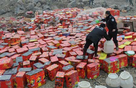 1月20日,公安執(zhí)法人員正在往假冒偽劣煙花爆竹上澆柴油,準(zhǔn)備銷毀。 當(dāng)日,重慶市公安、安監(jiān)、供銷等部門在重慶鋼鐵公司歌樂山采礦場(chǎng)對(duì)5200余件非法煙花爆竹進(jìn)行集中銷毀。