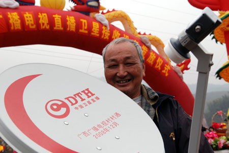 1月21日,廣西昭平鎮(zhèn)橫江屯農(nóng)民在發(fā)放儀式上領(lǐng)取廣播電視直播衛(wèi)星接收設(shè)備。 當(dāng)日,廣西昭平縣在大山深處的昭平鎮(zhèn)橫江屯舉辦“村村通廣播電視直播衛(wèi)星接收設(shè)備”發(fā)放儀式,該屯37戶農(nóng)民都領(lǐng)到了一套衛(wèi)星接收設(shè)備。在技術(shù)人員的指導(dǎo)下,該屯農(nóng)民當(dāng)天就能收看(收聽)到54套衛(wèi)星電視節(jié)目、48套立體聲廣播節(jié)目。春節(jié)前夕,昭平縣共有263個廣播電視“盲點(diǎn)村”的2萬多名農(nóng)民結(jié)束了收聽、收看廣播電視難的歷史。 |