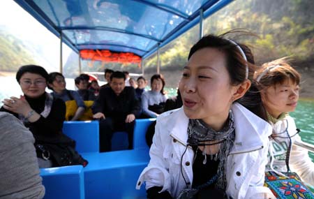 2月11日,黃華英在渡船上與游客交談。 當(dāng)日,應(yīng)聘到張家界大峽谷景區(qū)擔(dān)任講解員的湖南省張家界市慈利縣三官寺鄉(xiāng)返鄉(xiāng)農(nóng)民工黃華英帶著一批游客在景區(qū)內(nèi)游覽。黃華英是張家界大峽谷景區(qū)已招聘錄用的17名返鄉(xiāng)農(nóng)民工之一,此前她曾在廣東東莞一家印刷廠打工,2008年回到家鄉(xiāng)。 目前,張家界大峽谷景區(qū)講解員招聘工作仍在與景區(qū)建設(shè)同步進行中,景區(qū)管理層表示“在同等條件下優(yōu)先聘用返鄉(xiāng)農(nóng)民工”,為返鄉(xiāng)農(nóng)民工提供就業(yè)機會。 |