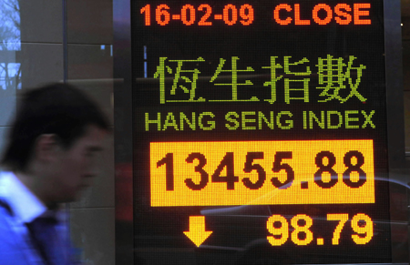 2月16日,一名市民從香港灣仔恒生指數(shù)電子顯示屏前走過。當(dāng)日,香港恒生指數(shù)下跌98.79點(diǎn),收?qǐng)?bào)13455.88點(diǎn)。