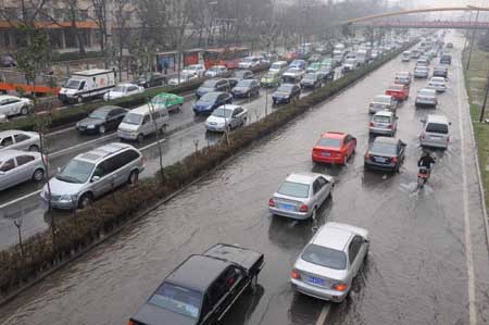 2月18日晨,由于自來(lái)水主管道輸水聯(lián)絡(luò)線爆裂,陜西省西安市南二環(huán)長(zhǎng)安大學(xué)路段汪洋一片,造成交通擁堵。自來(lái)水公司管網(wǎng)搶修人員快速趕到現(xiàn)場(chǎng)進(jìn)行搶修,該路段交通于上午9時(shí)左右恢復(fù)正常。圖為車輛在西安市南二環(huán)長(zhǎng)安大學(xué)附近路段涉水前行。