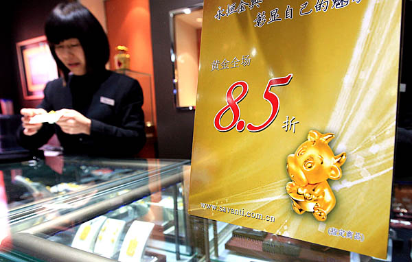 3月10日,上海市的一家金飾品店在柜臺(tái)上擺出調(diào)價(jià)標(biāo)簽。當(dāng)日,上海黃金行業(yè)協(xié)會(huì)發(fā)布信息,從3月10日起,上海黃金飾品市場價(jià)從每克271元降至262元,紀(jì)念型金條的市場價(jià)從每克259元降到252元。信息顯示,上海的黃金飾品價(jià)格已低于香港。