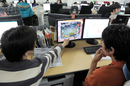 金融危機為文化產(chǎn)業(yè)開啟了一扇門。3月12日,處于中國網(wǎng)絡游戲開發(fā)運營領先位置的福州網(wǎng)龍公司的研發(fā)人員在游戲測試中。新華社記者:姜克紅