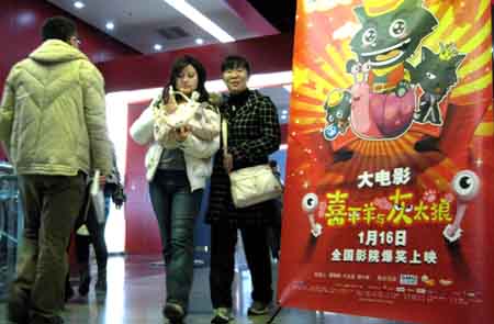 國產(chǎn)動畫片逆風飛揚,“喜羊羊”票房突破八千萬。在北京首都電影院,觀眾走過《喜羊羊與灰太狼之牛氣沖天》電影海報展板。